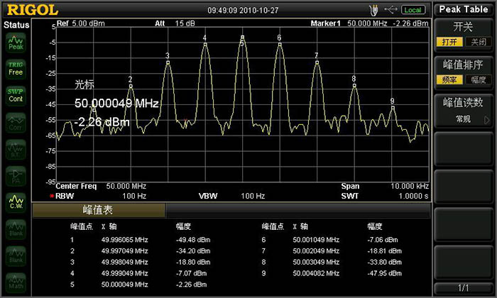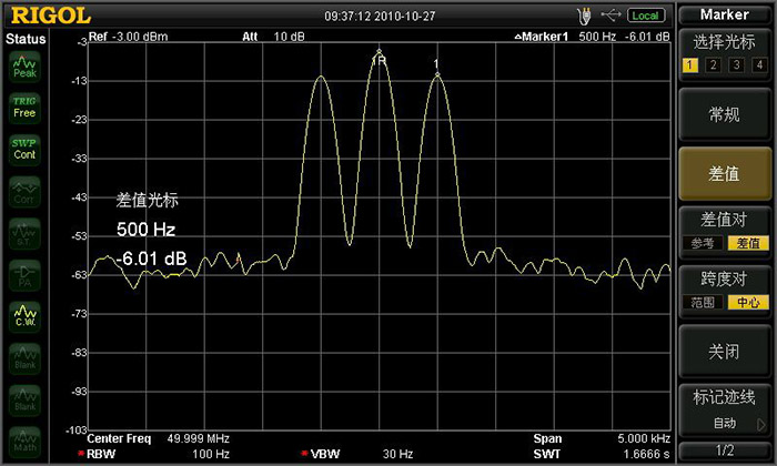 借助于100Hz RBW,清晰分辨出相鄰的2個(gè)信號(hào)