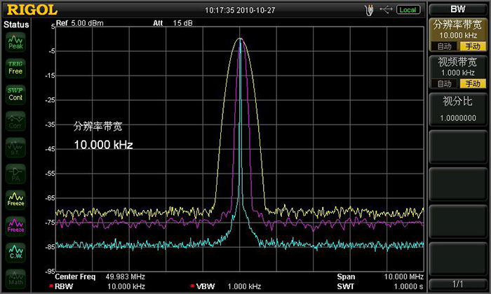 通過(guò)不同顏色的跡線清晰觀察比較改變RBW后的頻譜變化
