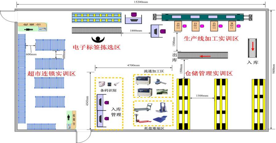 整个“物流实训中心”主要由存储保管实训区,输送分拣实训区、链生产线、连锁营销门店区、电子标签辅助分拣实训区、自动识别技术与应用区、物流辅助设备区组成。