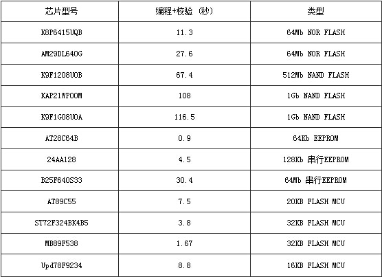 • 讀寫程速度無(wú)與倫比編程+校驗(yàn)一片1Gb NAND FLASH ()存儲(chǔ)器 僅須108秒,64Mb NOR FLASH (僅需。11.3秒。芯片燒寫速度平均提高3倍。