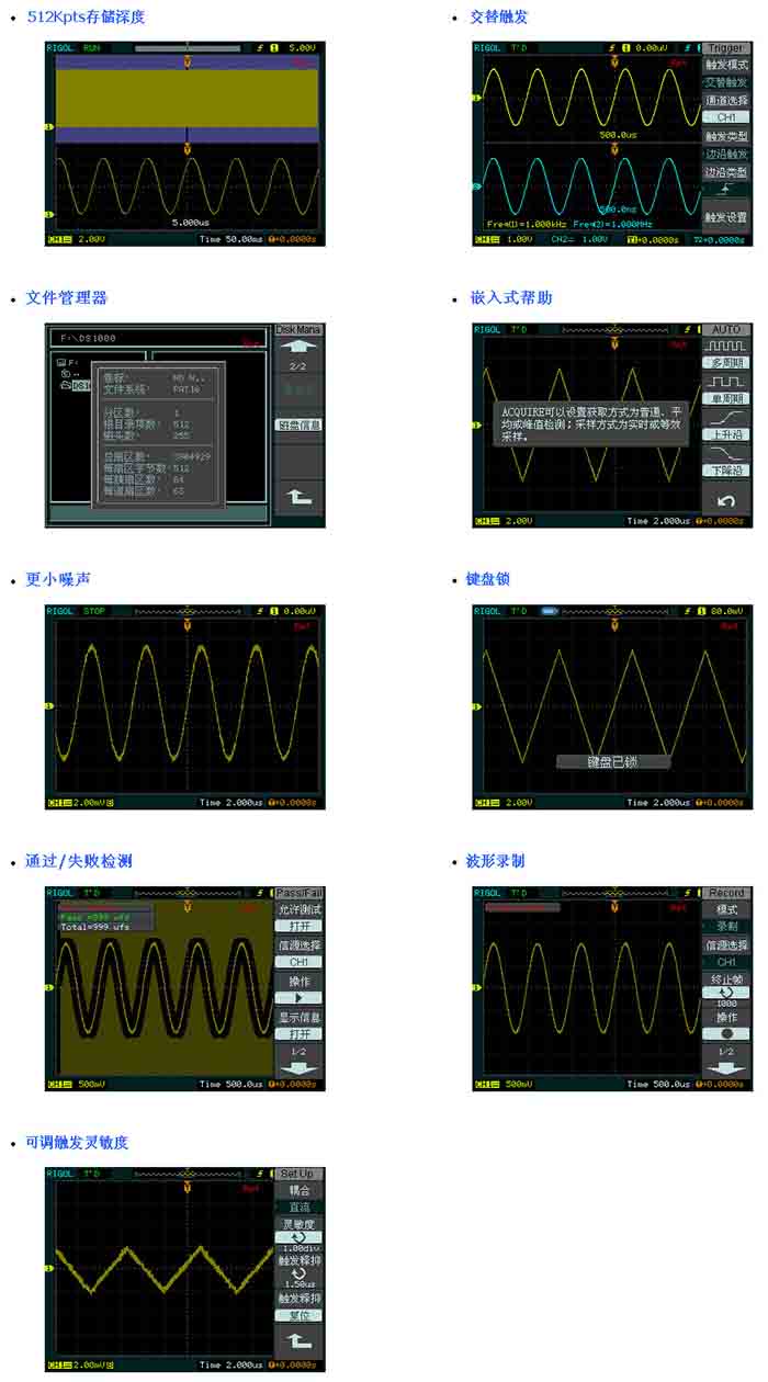具有丰富的触发功能:边沿、脉宽、视频、斜率、交替触发